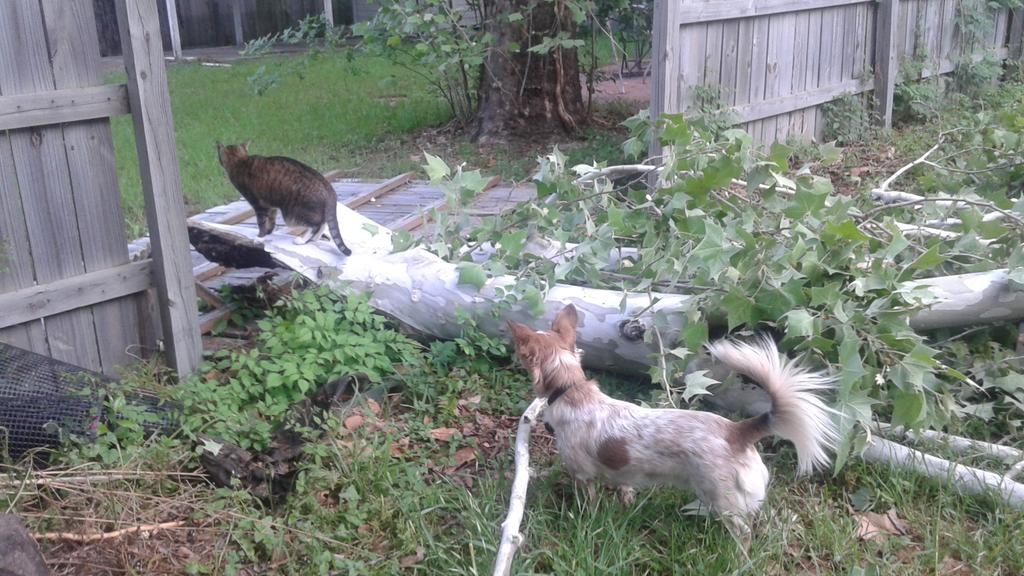 Or, more precisely, a tree in our neighbors' yard snapped...not quite in half, more like at the point a third of the way down from the top, and this piece of the tree fell into our yard. Fuzzy was in the yard at the time; there was a little wind, and very light rain, and I didn't even hear the fall so much as her yelling.